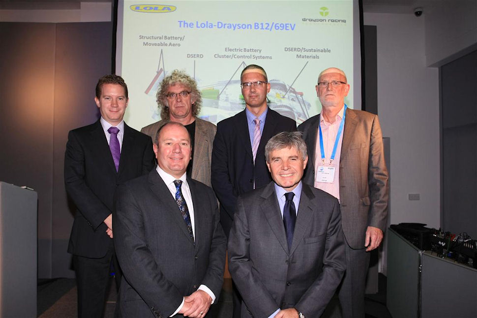 From left to right: Back: Thomas Buckler (Cosworth) Larry Holt (Multimatic), James Baker (BAE Systems), Dick Stimpson (Halo IPT); Front: Robin Brundle (Lola Group), Lord Paul Drayson (Drayson Racing Technologies).